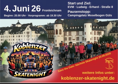 Am Donnerstag, den 4. September 2025, findet zum zweiten Mal in diesem Jahr die beliebte Koblenzer Skatenight statt. Mit der Rheindörfertour in Güls startet das Event um 19:30 Uhr mit einigen Aufwärmübungen – dem Warm up. Um 20:00 Uhr beginnt dann der gemeinsame Rollspaß vom Wochenmarktplatz in Güls, Gulisastraße, bei dem alle Teilnehmenden auf Inlineskates die Straßen der Koblenzer Rheindörfer erkunden.